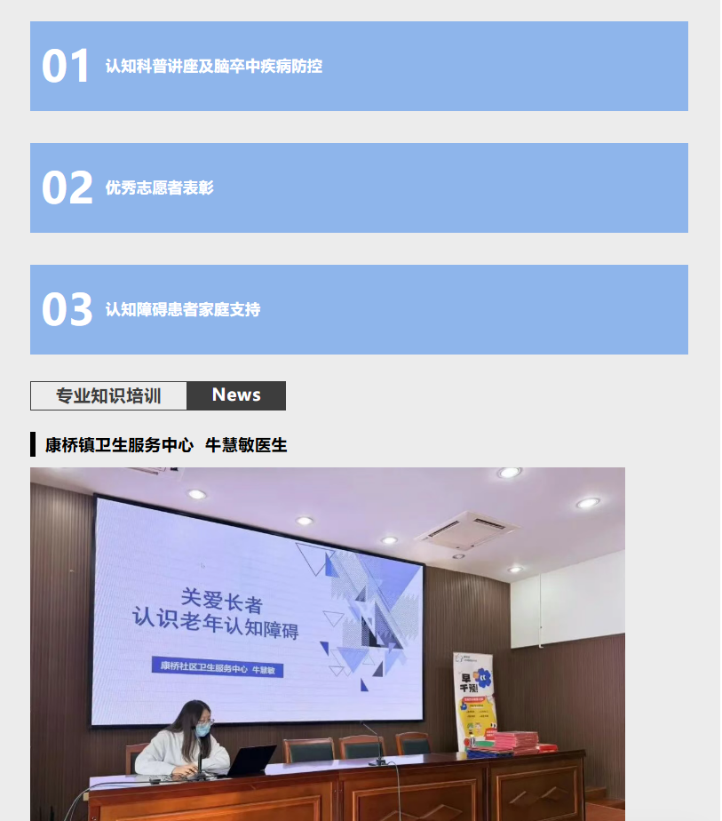 预防保健科的牛慧敏医生给台下的认知障碍友好社区志愿者科普了有关关爱长者 认识老年认知障碍的科普知识,牛慧敏医生从老年认知障碍概述、发病机制与风险因素、临床表现与评估工具、预防与干预、护理与支持要点几个方面介绍。科普能让大众和家属掌握认知障碍的早期信号,实现早发现、早干预、延缓病情进展;同时可以打破“老糊涂是正常现象”的误区。