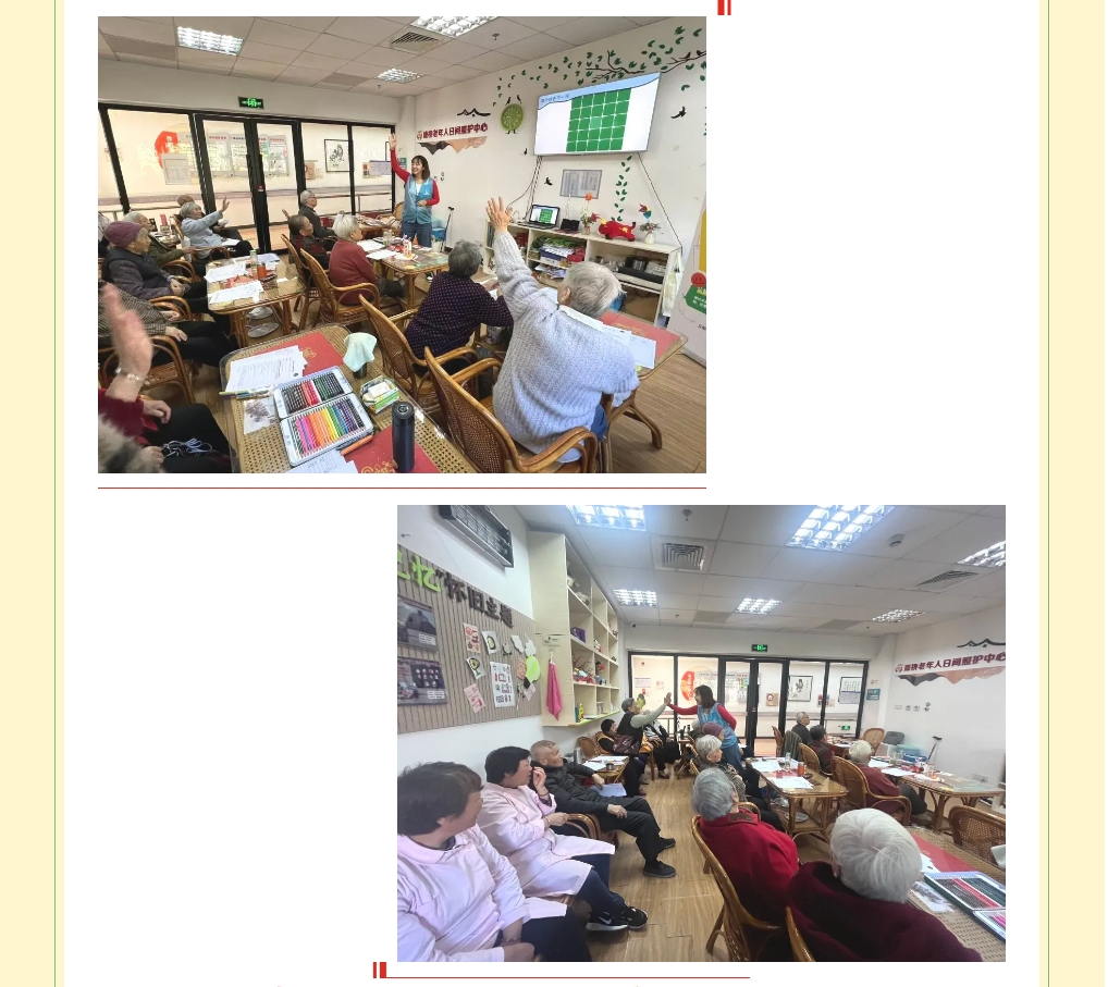 通过色感小游戏来考验长者们对于颜色的分辨。随着难度的不断增加,举起的手也越来越多,每个人都在积极的回答自己的想法,有答对给自己鼓掌的奶奶,也有积极抢答的爷爷,在欢乐中锻炼了色彩感知能力和空间能力。