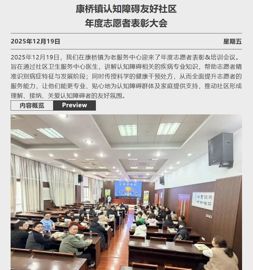 预防保健科的牛慧敏医生给台下的认知障碍友好社区志愿者科普了有关关爱长者 认识老年认知障碍的科普知识,牛慧敏医生从老年认知障碍概述、发病机制与风险因素、临床表现与评估工具、预防与干预、护理与支持要点几个方面介绍。科普能让大众和家属掌握认知障碍的早期信号,实现早发现、早干预、延缓病情进展;同时可以打破“老糊涂是正常现象”的误区。